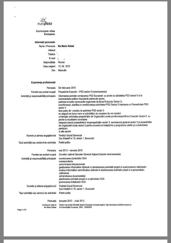 Potrivit un CV publicat pe pagina de Facebook a deputatului PMP, Robert Turcescu, Ilie Mario Rafael (43 de ani) a ocupat funcția de președinte executiv la PSD sector 5 din februarie 2015. În perioada mai 2013 – ianuarie 2015 menționează funcția de consilier cabinet secretar general adjunct la PSD. În CV nu menționează nici un fel de studii, singurul loc de muncă fiind la PSD.