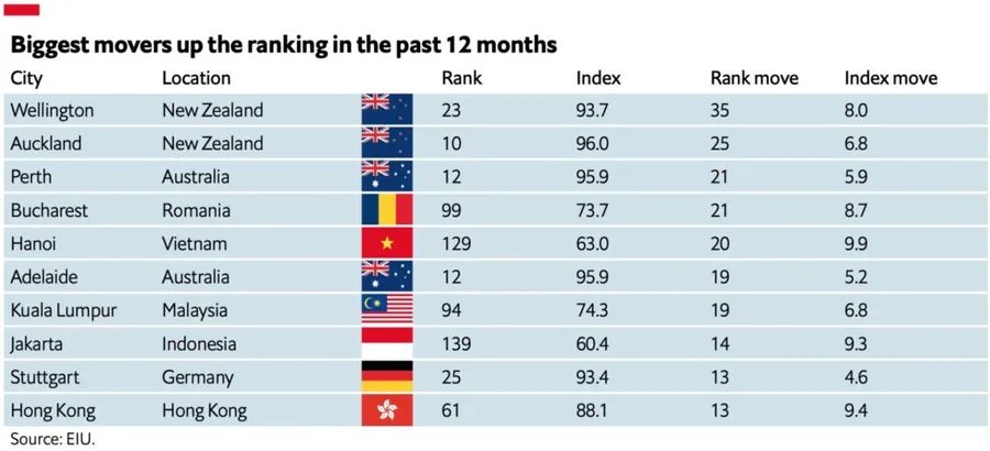 Potrivit EIU, orașele din Asia-Pacific au înregistrat unele dintre cele mai mari creșteri în clasamentul din acest an – reprezentând opt dintre primele 10 clasate.