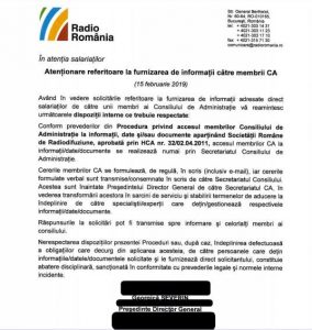 Trimite un mail către colegii din Consiliul de Administrație și cere în spiritul transparenței să se corecteze acest aspect. La doar câteva ore mai târziu, omul numit de majoritatea PSD-ALDE la conducerea Radio România emite un dictat către toți angajații instituției să nu răspundă niciunei cereri.